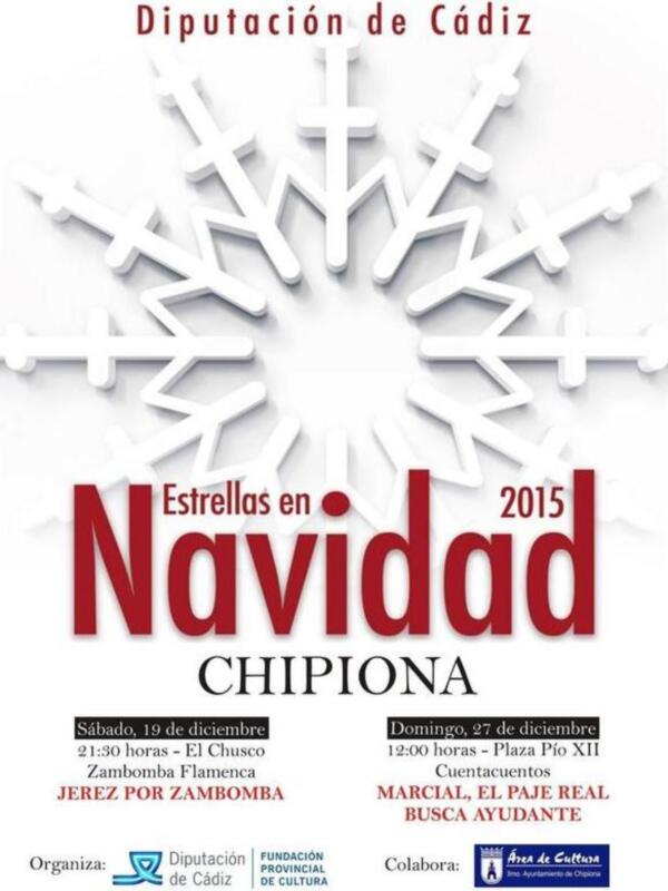 Radio-Televisión Municipal de Chipiona, 9 de diciembre de 2015. Chipiona contará en las próximas fechas navideñas dos actividades culturales que llegarán a través de la Fundación Provincial de Cultura con la colaboración del Área Municipal de Cultura. La Diputación de Cádiz vuelve a ofrecer el programa Estrellas de Navidad que trata de dinamizar la actividad de los municipios en estas fiestas por medio de zambombas, corales, artes escénicas e iniciativas de fomento de la lectura, básicamente propuestas de índole tradicional que son demandadas por los municipios para estos días de diciembre. La localidad contará el sábado 12 de diciembre con el espectáculo Jerez por zambomba que se ofrecerá en la Taberna El Chusco desde las 21:30 horas y el domingo 27 a las 12:00 h. en la Plaza Pío XII a la compañía Animarte con Marcial, el paje real, busca ayudante. Ello se suma a las actividades programadas por el Ayuntamiento y la Asociación de Belenistas Caepionis y las que promueve Acitur.