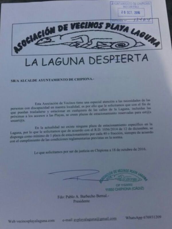 La Asociación de vecinos Playalaguna ha solicitado al Ayuntamiento de Chipiona que se creen plazas de aparcamiento reservadas para personas con discapacidad en las calles de la Urbanización de La Laguna, incluidas las próximas a los accesos a la zona de playa.