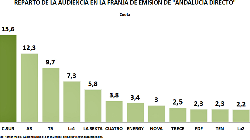 Destaca el liderazgo de “Andalucía directo”, con un 15,6% de cuota de pantalla (261.000 espectadores de audiencia media y 567.000 de audiencia acumulada), que aventaja en 3,3 puntos a su competencia directa.