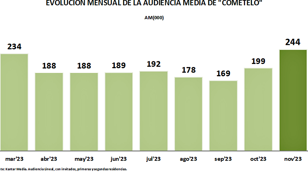 En la franja de tarde “La tarde, aquí y ahora”, marca el 11,3% y 211.000 espectadores de media, y “Cómetelo”, en este mes de noviembre ha promediado una cuota de pantalla del 12,8% su mayor audiencia media de los últimos 9 meses con 244.000 espectadores.