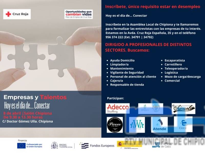‘Talleres Empresa y Talento: Hoy es el día de Conectando Empleo’, así se presenta un evento de intermediación laboral organizado por Cruz Roja Española para el miércoles 8 de abril. Su objetivo es generar oportunidades reales de inserción laboral para personas en búsqueda activa de empleo.
