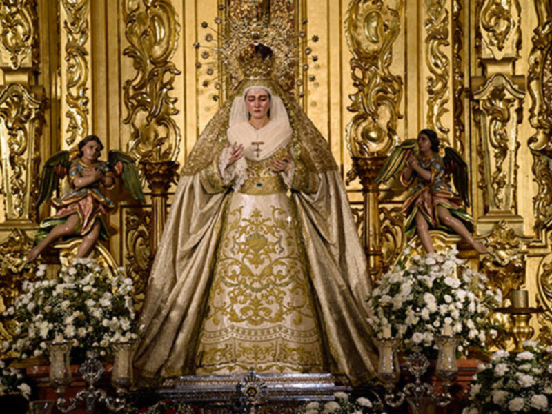 Llegada la temporada estival y como es tradición en la Ciudad de Sevilla y Provincia, las dolorosa de las hermandades son ataviadas generalmente con ropaje de color blanco, así permanecerá hasta que llegue el mes de septiembre. En la mayoría de los casos, el color de las vestimentas está sujeto al calendario litúrgico. Para los cultos y besamanos se le viste de reina, en noviembre luce colores negros, por la festividad de Todos los Santos, en diciembre de celeste o azul por la festividad de la Inmaculada Concepción, para la cuaresma se le viste de hebrea. El color blanco simboliza la pureza y se la suelen ataviar con estos colores tras la Pascua de Resurrección, que se prolonga hasta época estival. Así de guapa ha aparecido la madre de Dios Ilipense junto a su hijo crucificado, bajo la advocación de las Angustias, trabajo realizado por la Priostia de la Hermandad y los vestidores o vestidoras que nos están redescubriendo a una dolorosa antigua de una calidad excepcional.