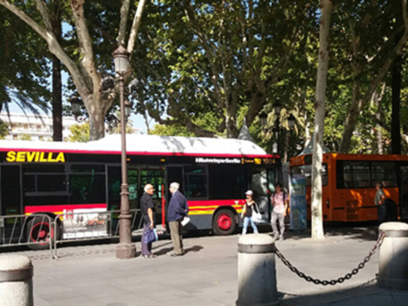 Tussam en la Plaza Nueva expone los modelos de bus utilizados, el pasado y el presente