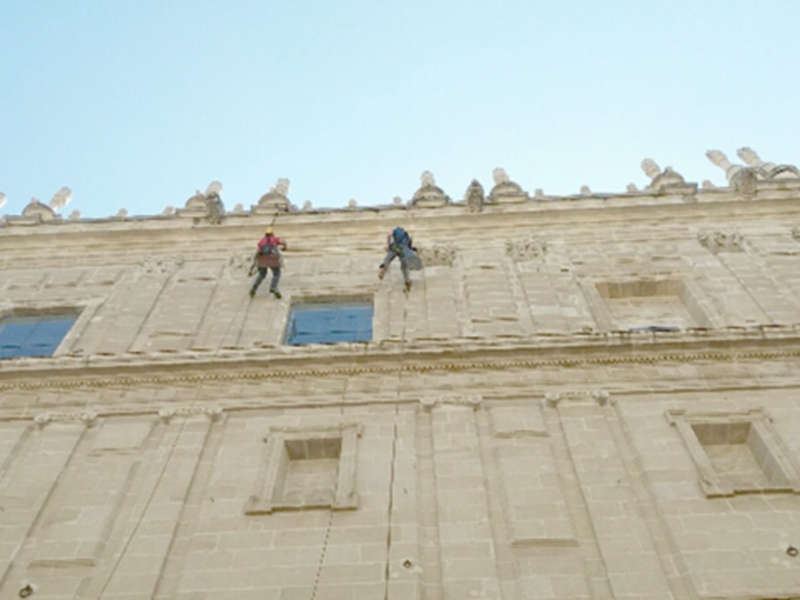 Los transeúntes que paseaban hoy por la avenida de la Constitución, han podido ver con sorpresa como unos especialistas en escalada realizaban trabajos en la fachada lateral.