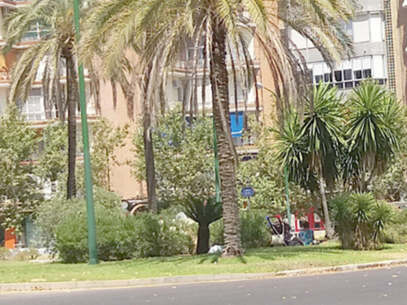 El cálido verano hace que los ciudadanos busquen sombra, vegetación y si hay agua, mejor; este es el caso de la rotonda de la Gran Plaza de Sevilla, en la que se puede ver a una señora sentada a la sombra. Anteriormente se había visto a unos jóvenes que se refrescaban en el interior de la fuente.