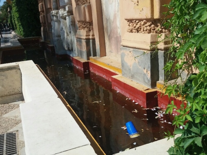 Los turistas que visitan Sevilla los fines de semana, ven una ciudad con maceteros vacíos y sucios, estanques que no están operativos y excrementos