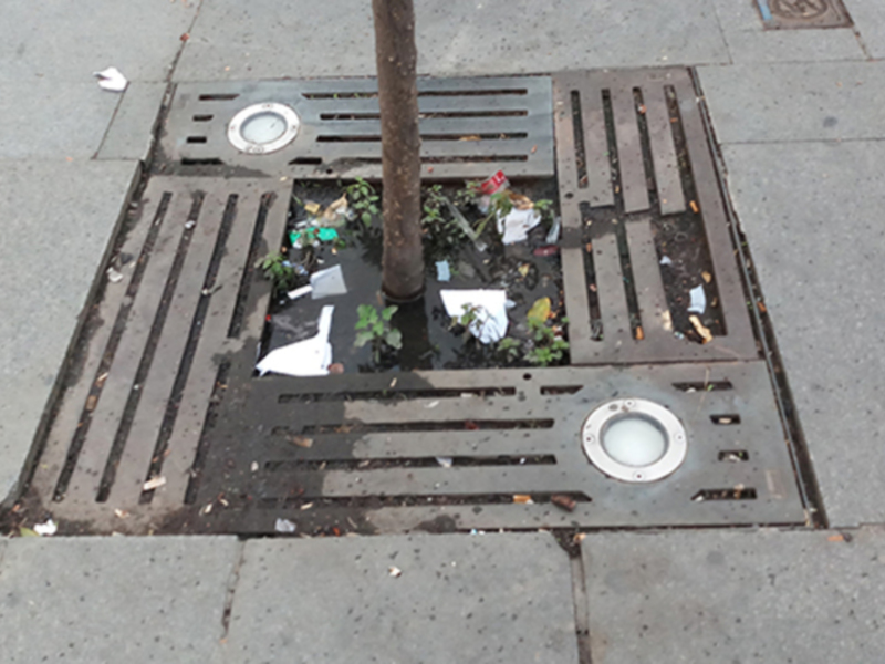 Alcorques sucios, encharcados con hierbas, papeles, y maceteros, sin plantas y con restos de colillas, papeles y vasos, son una mala imagen de la ciudad.