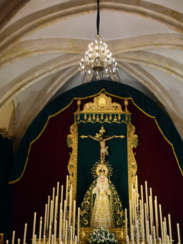 El altar de cultos constituye, uno de los más rico y singulares ejemplo de arquitectura efímera dedicado al culto tan común en tiempos pasado, entre las cofradías de la localidad; solo en ocasiones ajenas al deseo de la propia hermandad se ha dejado de montar este hermoso modelo de altar dedicado a honrar a la madre de Dios que representa uno de los más constante ejemplos de fidelidad a la estética de las cofradías Ilipense y de la tradicional Solemnidad de sus cultos. Os dejo una magnifica instantánea del esplendoroso altar pasajero que la Priostía de esta Hermandad de la Vera-cruz, de la ribereña localidad sevillana de Alcalá del río a elaborado presidiendo el presbiterio de la Parroquia de Santa María de la Asunción de la localidad ribereña. Extraordinario y magnífico trabajo de los Priostes y el de todo los que habéis participado en el montaje de este imponente altar efímero de cultos. En hora Buena