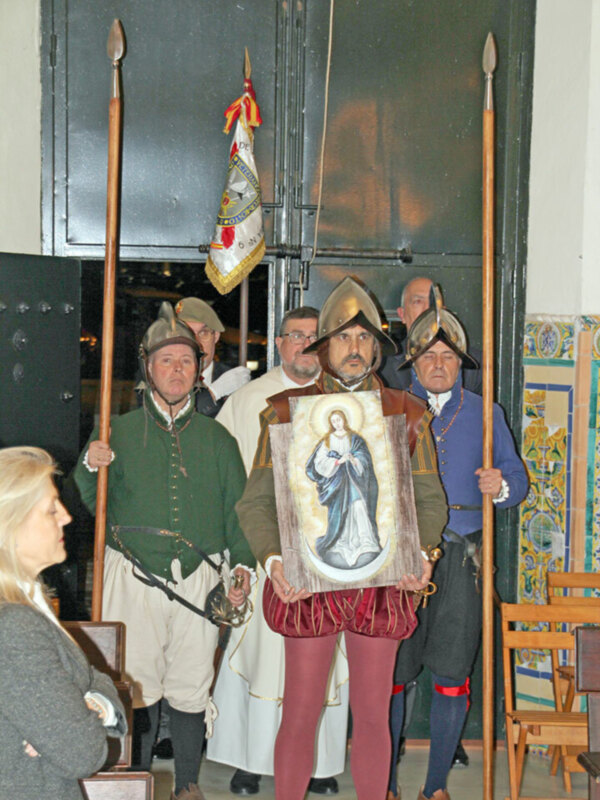 En esta celebración participan miembros del grupo de recreación histórica. Son ellos los que trasladan, en formación, la tabla con la imagen de la inmaculada al altar y forman junto al altar durante la misa.El milagro de Empel. Según las crónicas, el 7 de diciembre de 1585, el Tercio del Maestre de Campo Francisco Arias de Bobadilla, compuesto por unos cinco mil hombres, combatía en la isla de Bommel, situada entre los ríos Mosa y Vaal, bloqueada por completo por la escuadra del almirante Filips van Hohenlohe-Neuenstein. La situación era desesperada para los Tercios españoles, pues, además del estrechamiento del cerco, había que sumarle la escasez de víveres y ropas secas. El jefe enemigo propuso entonces una rendición honrosa pero la respuesta española fue clara: «Los infantes españoles prefieren la muerte a la deshonra. Ya hablaremos de capitulación después de muertos». Ante tal respuesta, Hohenlohe-Neuenstein recurrió a un método harto utilizado en ese conflicto: abrir los diques de los ríos para inundar el campamento enemigo. Pronto no quedó más tierra firme que el montecillo de Empel, donde se refugiaron los soldados del Tercio. En ese crítico momento un soldado del Tercio cavando una trinchera tropezó con un objeto de madera allí enterrado. Era una tabla flamenca con la imagen de la Virgen María. Anunciado el hallazgo, colocaron la imagen en un improvisado altar y el Maestre Bobadilla, considerando el hecho como señal de la protección divina, instó a sus soldados a luchar encomendándose a la Virgen Inmaculada Esa noche se desató un viento completamente inusual e intensamente frío que heló las aguas del río Mosa. Los españoles, marchando sobre el hielo, atacaron por sorpresa a la escuadra enemiga al amanecer del día 8 de diciembre y obtuvieron una victoria tan completa que el almirante Hohenlohe-Neuenstein llegó a decir: «Tal parece que Dios es español al obrar tan grande milagro». Aquel mismo día, entre vítores y aclamaciones, la Inmaculada Concepción es proclamada patrona de los Tercios de Flandes e Italia. Sin embargo, este patronazgo se consolidaría trescientos años más tarde, después de que la bula Ineffabilis Deus del 8 de diciembre de 1854 proclamase como dogma de fe católica la Concepción Inmaculada de la Virgen Santísima. El 12 de noviembre de 1892, a solicitud del Inspector del Arma de Infantería del Ejército de Tierra de España, por Real Orden de la Reina Regente doña María Cristina de Habsburgo.