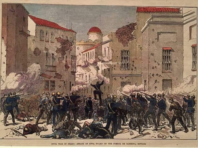 OTRO 18 DE JULIO ... EL de 1873, en el Convento de los Terceros, que tras la desamortización de Mendizábal, se había tomado como cuartel militar, se crea el Cantón Federal de Andalucía la Baja o Cantón de Sevilla. El cantón finalizó tan rápido como violentamente y culminó el 31 de Julio de 1873 reprimido por las tropas del General Pavía. En la imagen podemos ver a las tropas del general a la altura de la Puerta Carmona, en lo que hoy es el cruce con Recaredo. Falta el cartel de capirotes y la pollería…No veas el día de hoy a lo que se presta , como está el patio...también hubo otros 18 de julio ..que no son los que hemos conocido donde había una paga extra..
