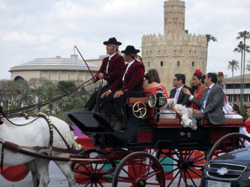 Durante estos días de feria es continuo el paso de carruajes y caballos que se encaminan a la Feria. La Torre del Oro testigo de este acontecimiento internacional permanece silenciosa a orillas del Guadalquivir. Imposible pasar inadvertida.