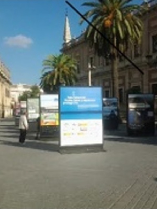 Ubicada entre la Catedral de Sevilla y el Archivo de Indias hay montada una curiosa exposición al aire libre sobre las aplicaciones prácticas de la Teledetección vía satélite. Es una zona de tránsito de peatones lo que está provocando que miles de personas la estén visitando. Bien ubicada.