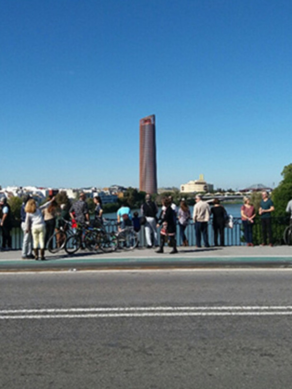 Esta imagen va siendo habitual. Además de una zona de paso de personas entre Triana y el centro de Sevilla, el Puente de Triana es un espacio situado estratégicamente que permite tener un amplio horizonte visual. Esto es aprovechado por turistas y visitantes para hacer fotos y llevarse un recuerdo de Sevilla. Hoy la Torre ya forma parte del paisaje.