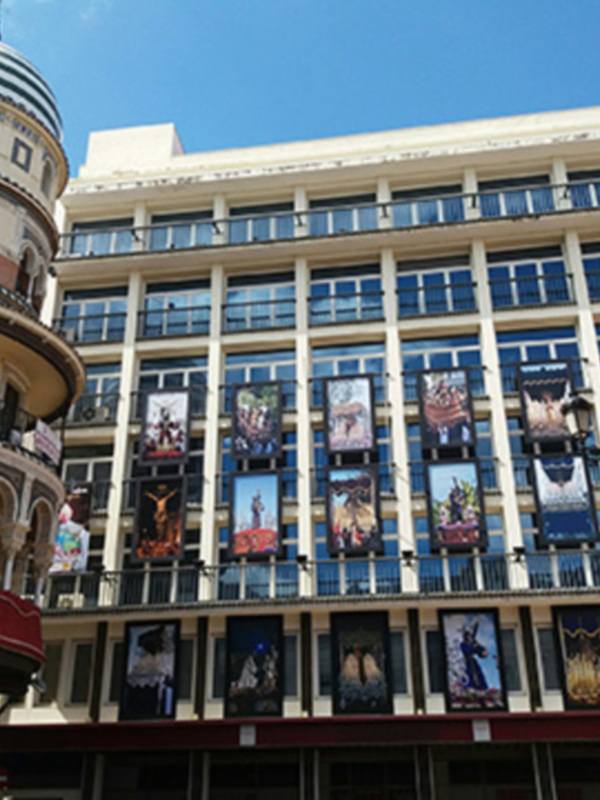 Estos días de Semana Santa se reúnen en las calles de Sevilla cientos de miles de personas compartiendo tradición religiosa y cultural para los sevillanos y espectáculo para los foráneos. Miles de personas se apiñan en las calles para ver pasar a los nazarenos y nazarenas y a los misterios que son una expresión artística con el trabajo realizado por imagineros, con el colorido de las flores y el olor a incienso y cera de las velas. Llama la atención los cuadros colocados en la avenida de la Constitución en la fachada del edificio situado frente al Bando de España. Los edificios se unen a la expresión artística y cultural. Bienvenida esta iniciativa.