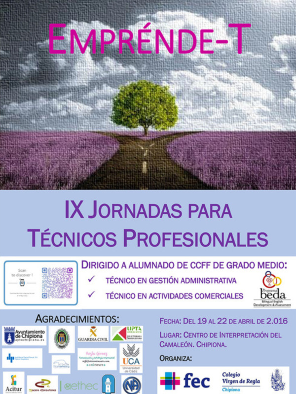 Radio-Televisión Municipal de Chipiona, 15 de abril de 2016. Los alumnos de los ciclos formativos de grado medio del Colegio Virgen de Regla participarán del 19 al 22 de abril en la novena edición de las jornadas para técnicos profesionales que organiza el centro y que ese año se desarrollan en el Centro de Interpretación de la Naturaleza y el Litoral El Camaleón bajo el lema ?Emprende-T?.