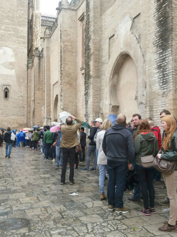 Continúan las colas de turistas en el acceso a la Catedral y al Alcázar. Los turistas resisten estoicamente la lluvia. Los responsables de estos monumentos deberían pensar en favorecer el acceso y el confort los visitantes.