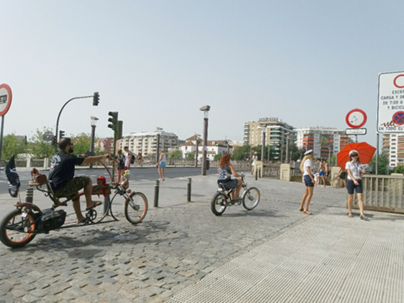 Los usuarios de la bicicleta en Sevilla cada día son más. La mayoría utilizan la bicicleta para desplazarse al trabajo pero también otros emplean su tiempo libre en disfrutar de un paseo en bici por Sevilla. Es el caso de esta pareja que tienen unas bicicletas tuneadas de gran vistosidad que llaman la atención.