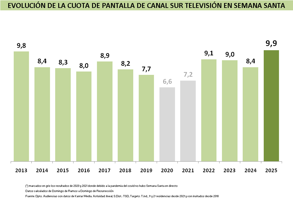 Canal Sur Televisión ha saldado la Semana Santa de este año 2025 con un 9,9% de cuota de pantalla de Domingo de Ramos a Domingo de Resurrección y ha superado todos los registros en este periodo desde el año 2013.