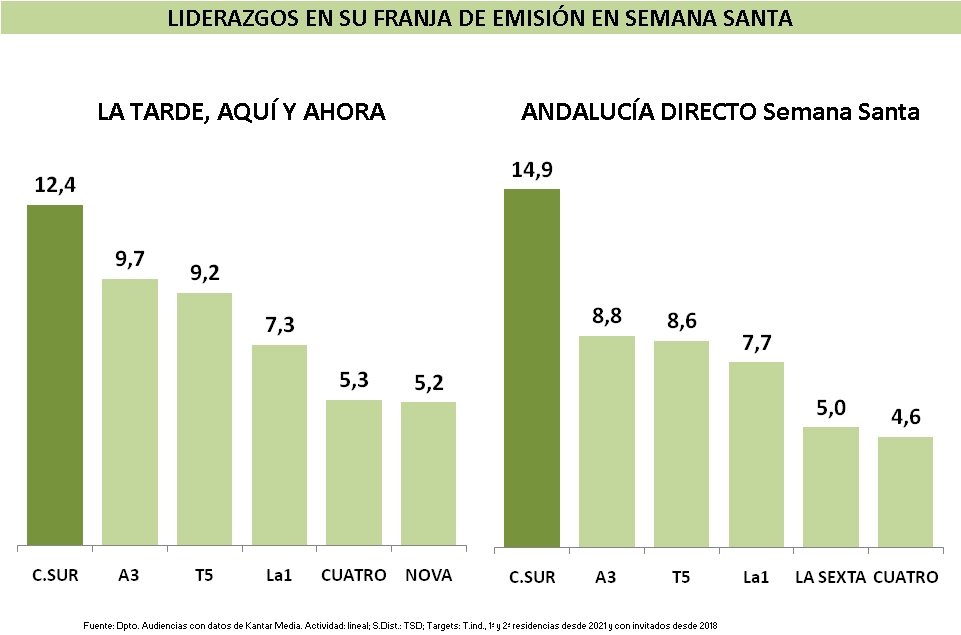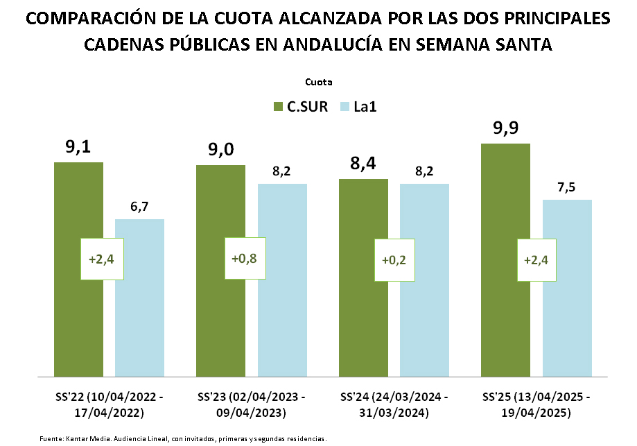 Canal Sur Televisión se afianza como la tercera opción en Andalucía y entre las televisiones autonómicas y se consolida como la televisión pública preferida por los andaluces y andaluzas. Además, es la cadena que más crece en nuestra comunidad autónoma en comparación a la Semana Santa del año 2024, con una subida de 1,5 puntos de cuota.