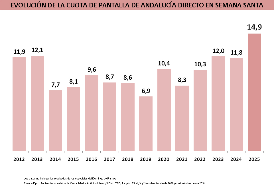 Los programas de Andalucía Directo especial Semana Santa han logrado su mejores resultados con un 14.9% de cuota, su mejor registro desde 2011; además son líderes absolutos tanto en Andalucía como entre las cadenas autonómicas.