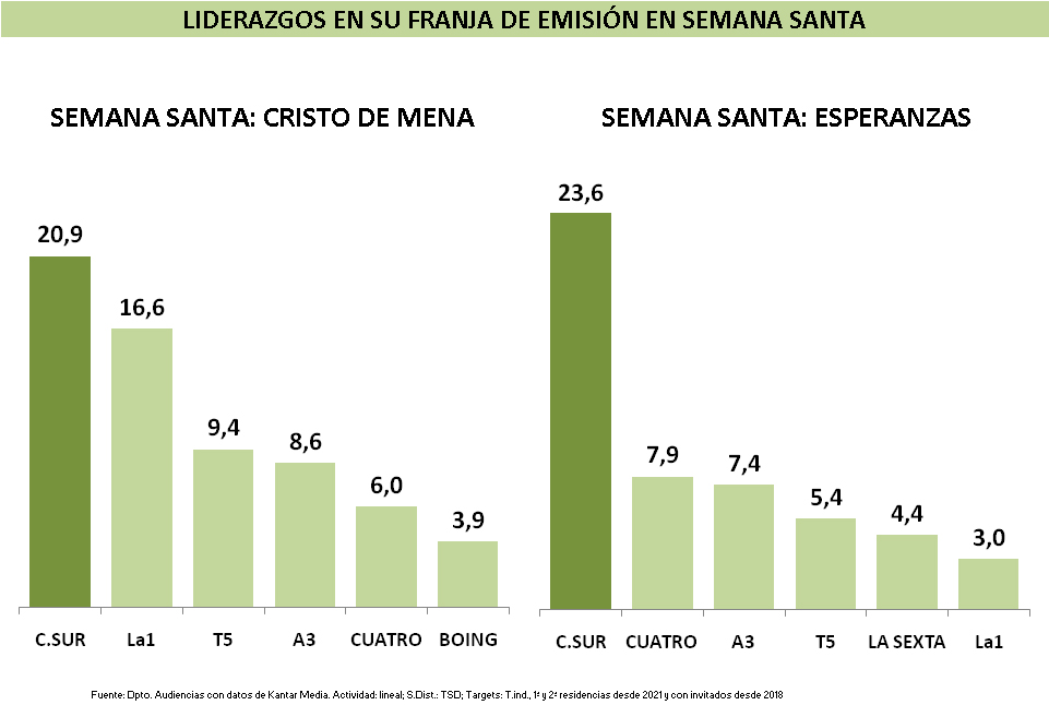 También destaca la retransmisión de "La Entronización del Cristo de Mena" con un 20,9% liderando su franja horaria de emisión y obteniendo su mejor resultado desde 2019.