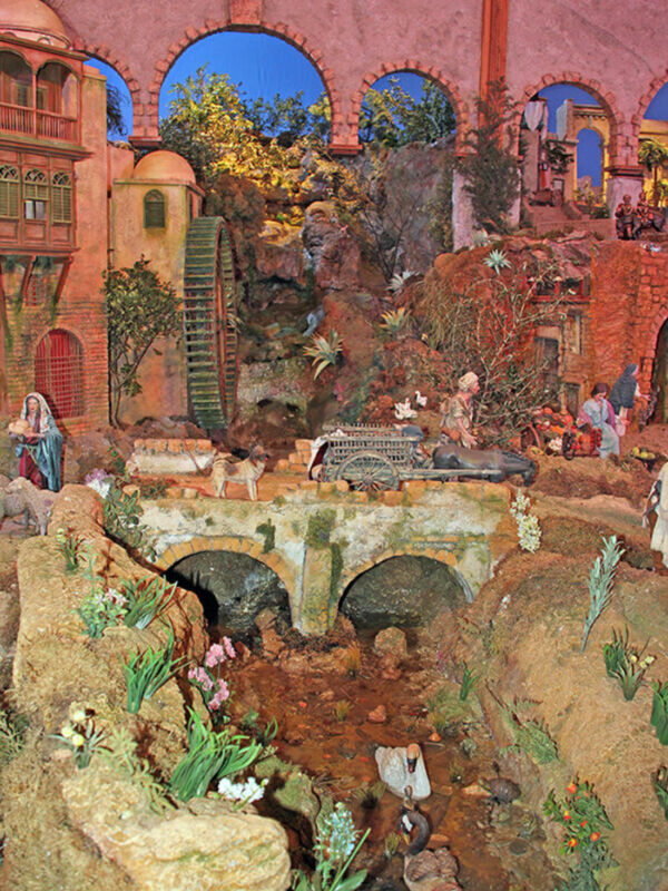 Ubicado en el patio principal de la sede de la Fundación, el belén ocupa una superficie expositiva de 240 metros cuadrados y ofrece un cuidado recorrido por la diversidad paisajística y cultural de Andalucía, con especial atención a las provincias de Málaga, Cádiz, Almería y Granada. La composición integra las montañas que se funden con el mar en el litoral malagueño, la luminosidad y el carácter atlántico de las playas gaditanas, así como la singular belleza de los pueblos almerienses y granadinos, con sus casas encaladas adaptadas a la orografía y al entorno natural. De manera excepcional, el misterio se sitúa este año en un entorno costero, aportando una lectura original y contemporánea a una representación profundamente arraigada en la tradición navideña.